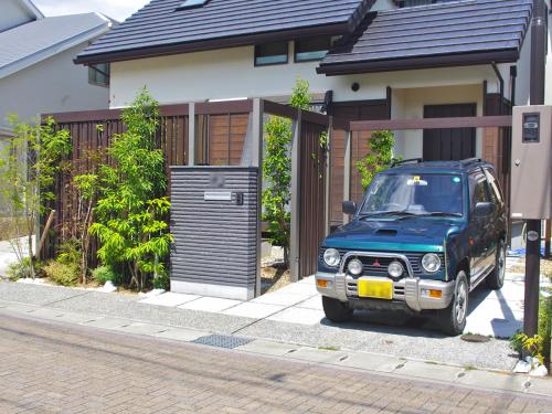 門柱中心に、お部屋の前に緑とパーテーショ