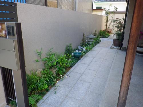 ポイントは日陰向きの植栽プランと、管理が楽でイメージに合ったより和風のイメージを強調できる庭としての雰囲気。