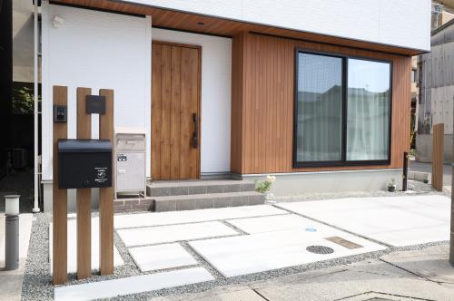 建物に合わせて配置した枕木材(LIXILデザイナーズパーツ)、アンティークな質感の舗装材トロンメル(クボタ)、そして施主さまが選ばれた支給品(表札、ポスト、宅配ボックス)などなど、相性ばっちりのナチュラルな外観に仕上がりました。